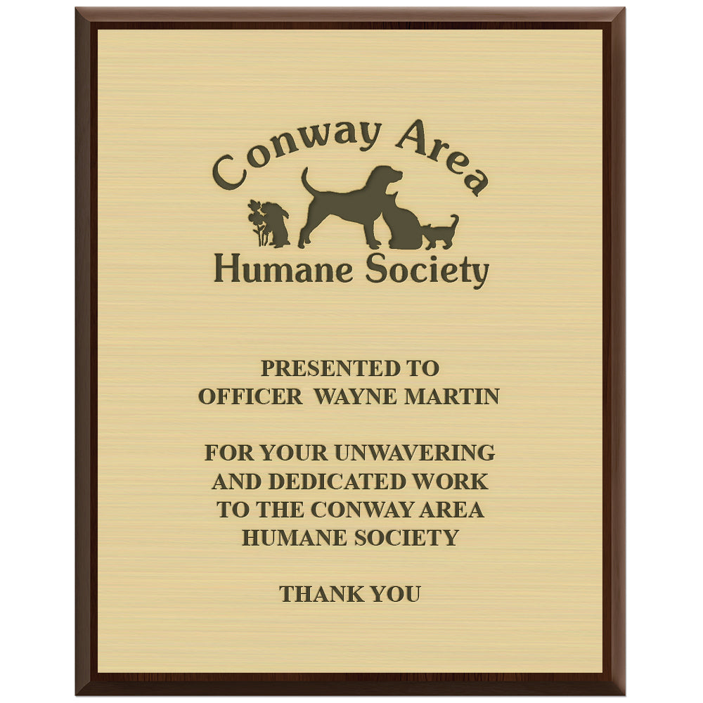 • Engraved brushed gold plate is secured to plaque