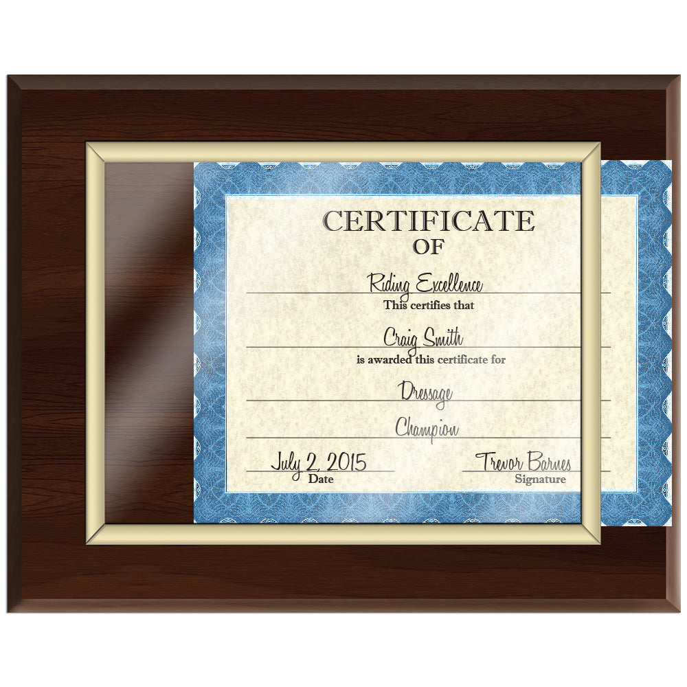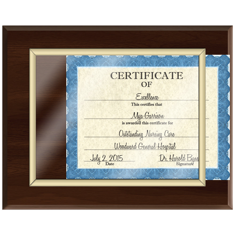 • Insert frame enables you to slide any 11"w x 8-1/2"h certificate or degree